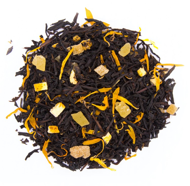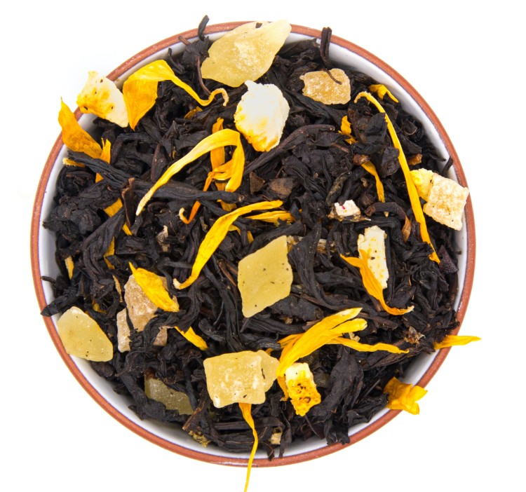 чай черный индийский, кусочки ананаса, кусочки лимона с цедрой, кусочки апельсина с цедрой, лепестки подсолнечника, аромат бисквита с лимоном.