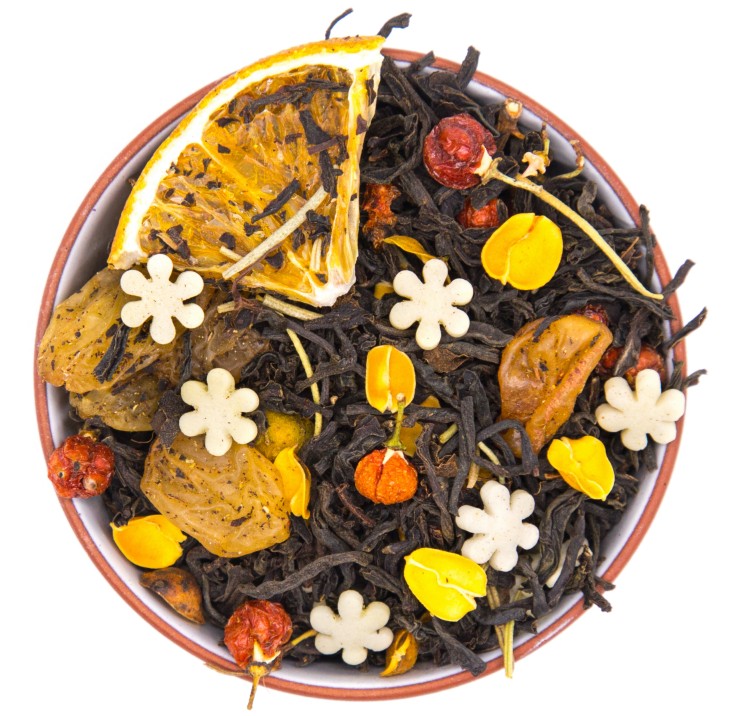 Чай черный индийский, изюм, акация цветы, посыпка кондитерская декоративная «Снежинки», апельсин сегмент, розмарин, аромат "Рождественская выпечка"