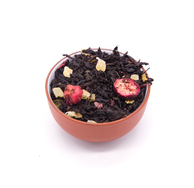 Смесь черных чаев, кусочки ананаса, кусочки клюквы, листья смородины, аромат клюквы и ванили