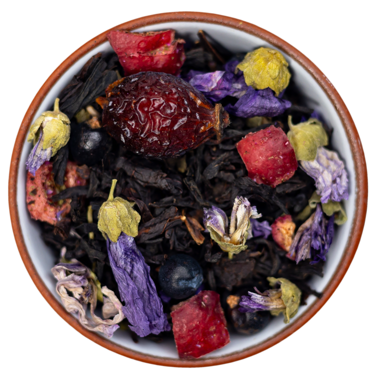 Чай черный индийский ассам, ягоды можжевельника, шиповник резаный, чабрец, мята перечная лист, мальва цветы, ягоды черной смородины, пищевой ароматизатор