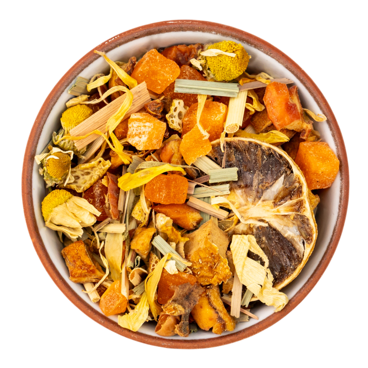 Лемонграсс, яблоко сушеное, папайя кусочки, сектор лимона, цедра апельсина, имбирь сушеный, ромашка цветы, лепестки календулы