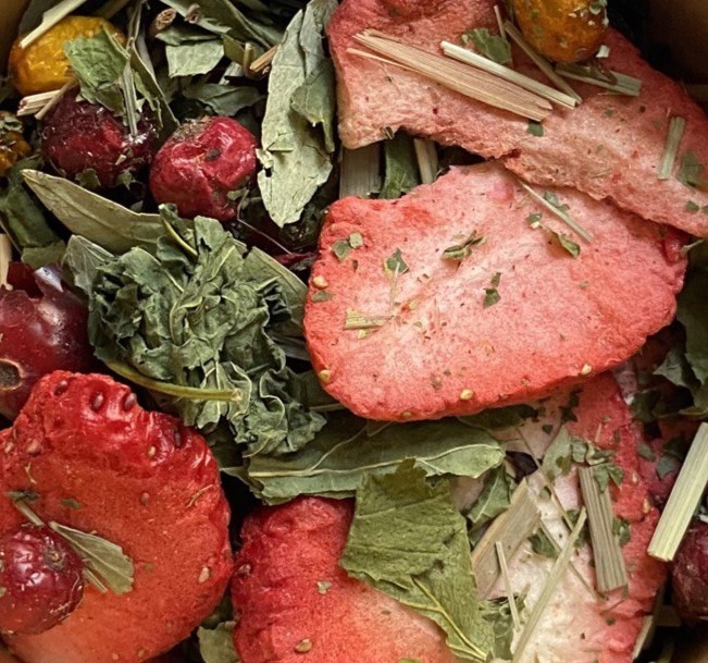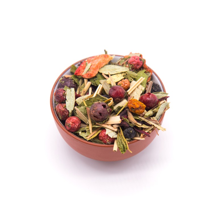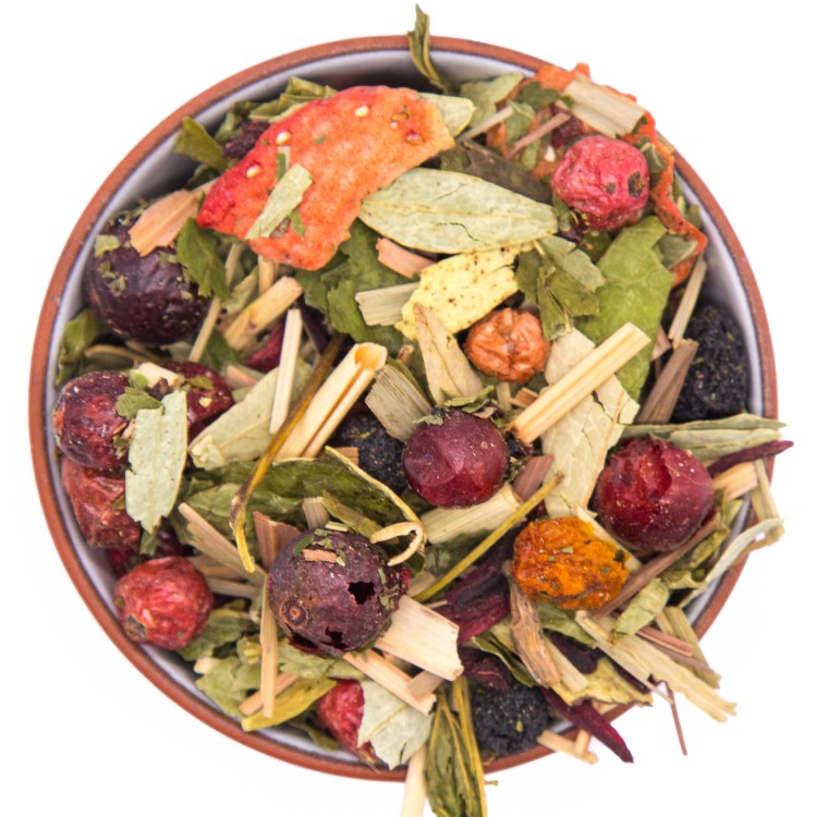 Лемонграсс, каркаде, ягоды рябины черноплодной, смородина лист, ягоды красной смородины, ягоды облепихи, слайсы клубники, сенна, слайсы клюквы, пищевой ароматизатор